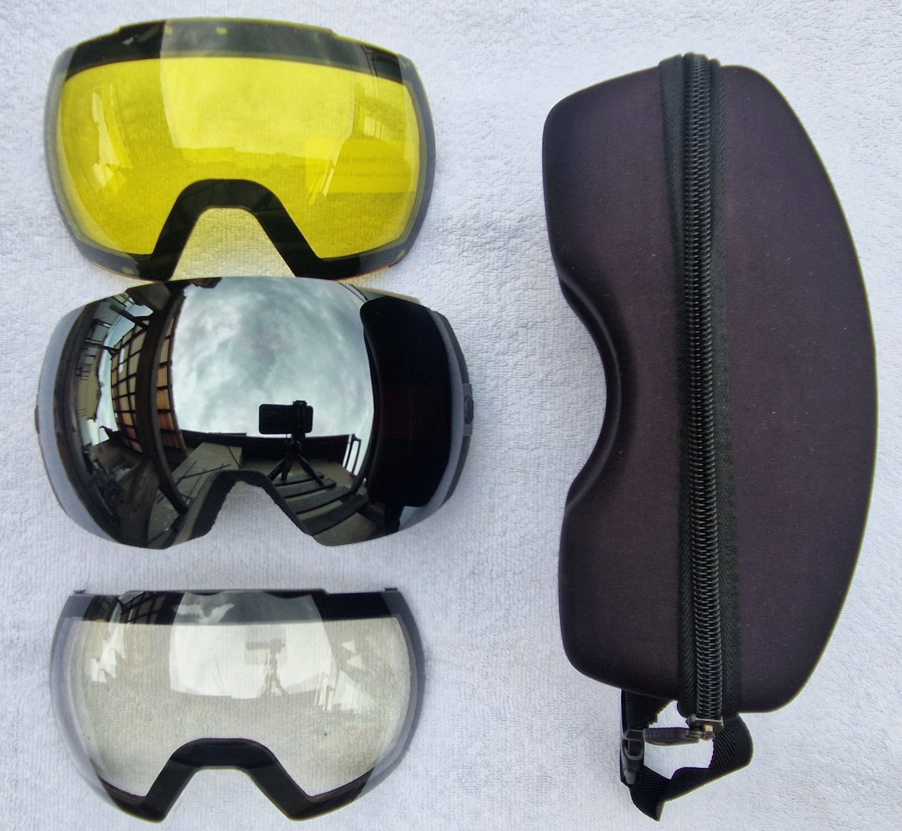 Kompletní balení zahrnuje brýle, tři skla, pevné pouzdro na zip.