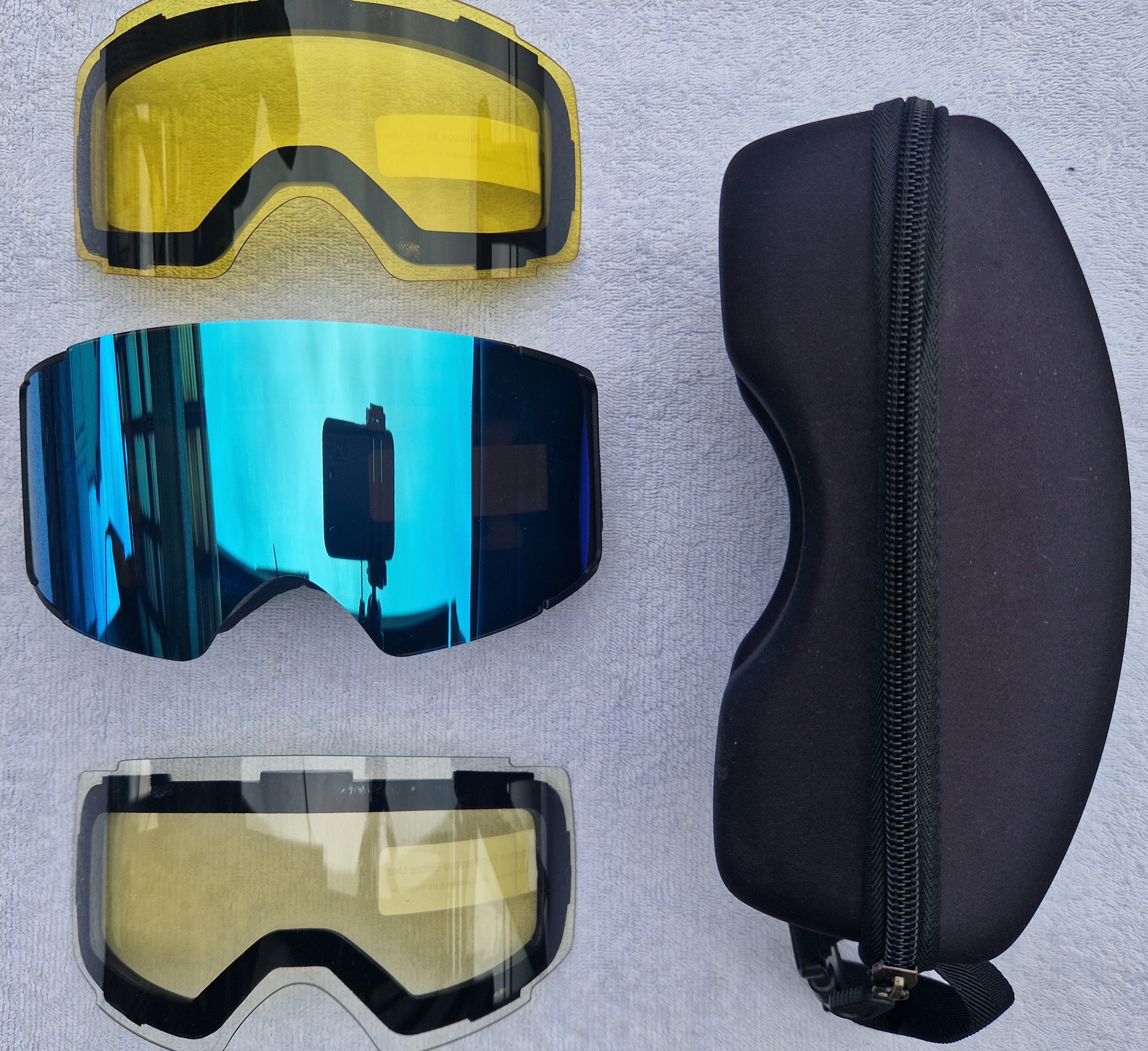 Kompletní balení zahrnuje brýle, tři skla, pevné pouzdro na zip.