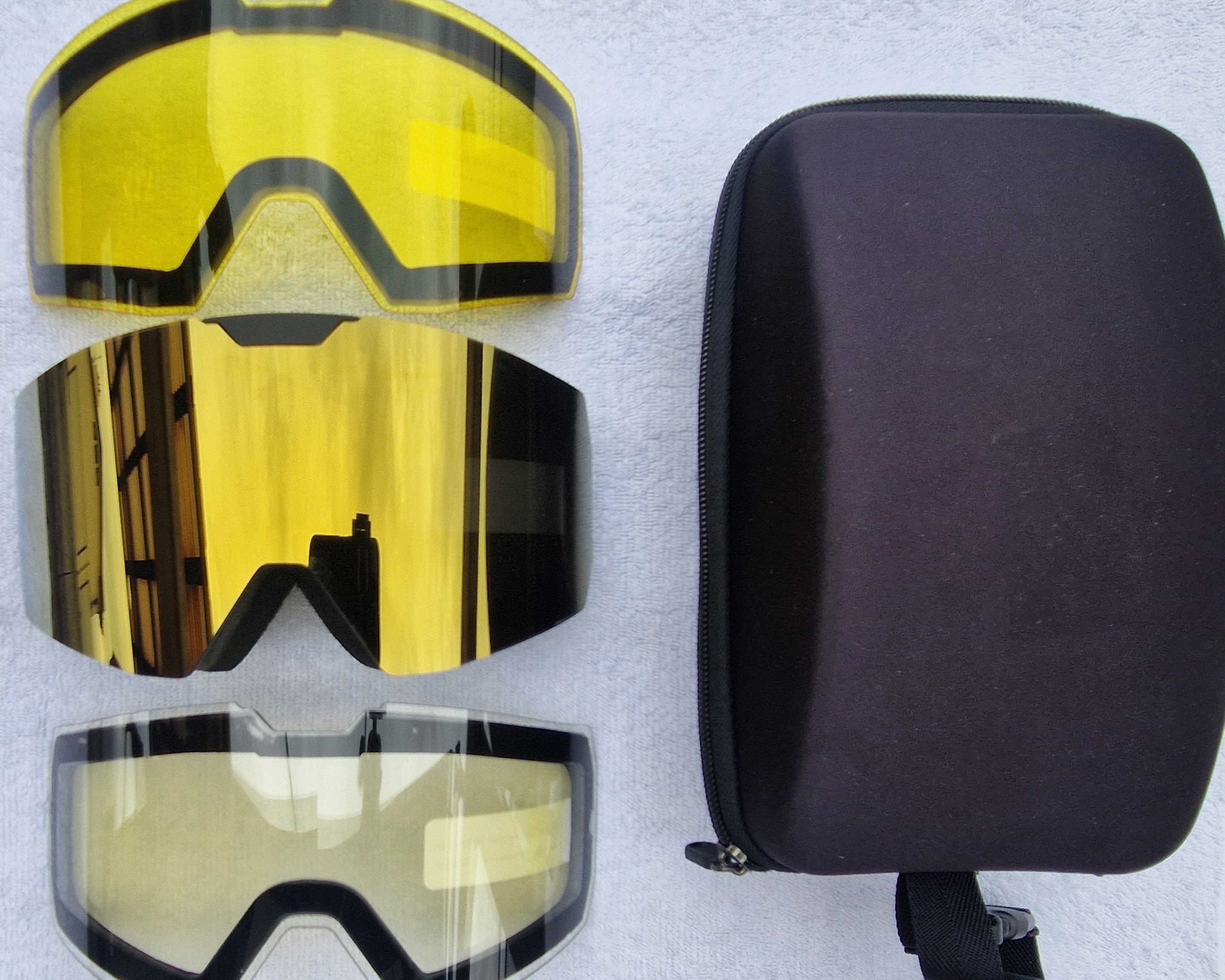 Kompletní balení zahrnuje brýle, tři skla, pevné pouzdro na zip.